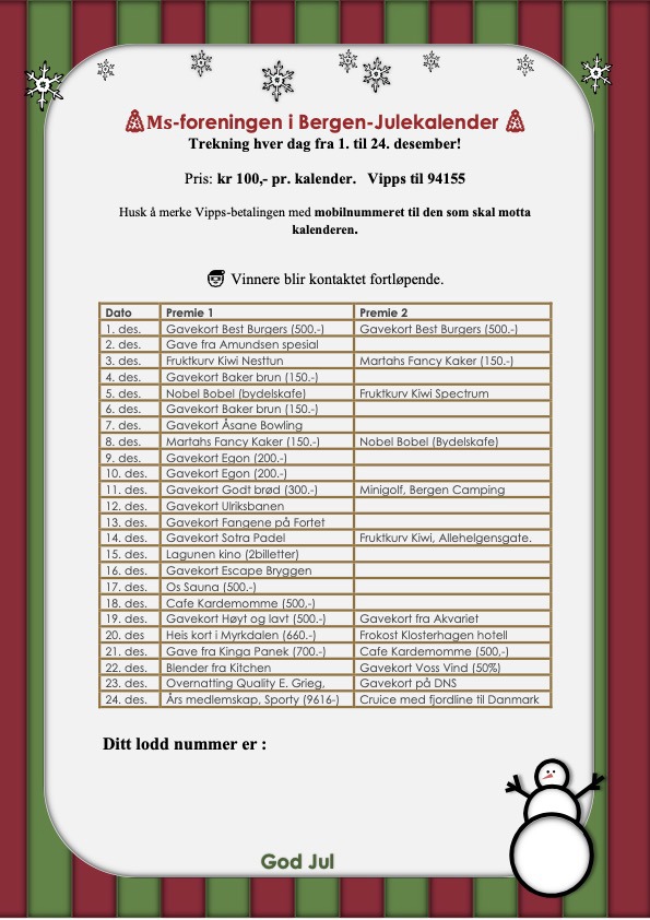 Gi desember litt ekstra mening i år! Når du kjøper vår flotte julekalender for 100 kroner, bidrar du direkte til MS-foreningens arbeid i Bergen – for mennesker som lever med multippel sklerose og deres pårørende.